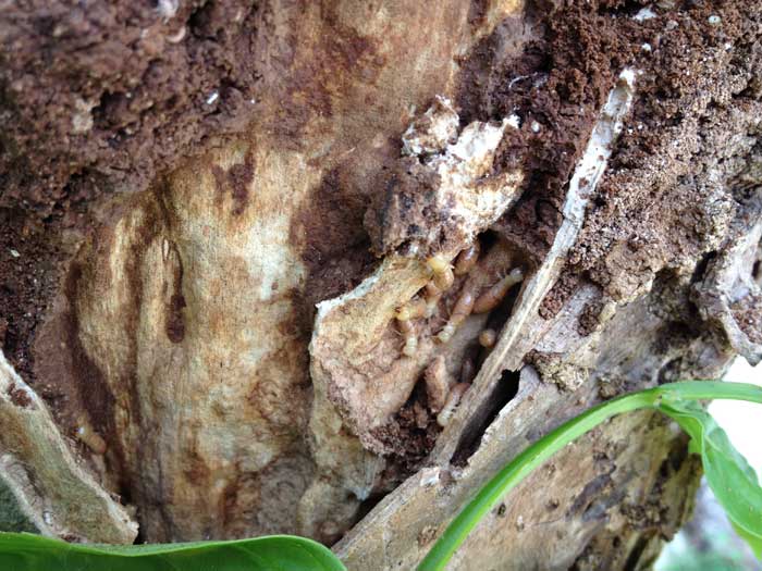 お客様の家屋に隣接して、四本の立ち木がシロアリに食べられおり、見た目「木が辛そう」でした。